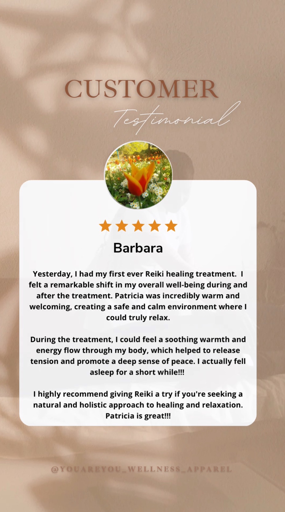 “Reiki is a wonderful healing tool, which provides a greater sense of well-being, eliminates stress and also helps to reduce depression.”– Patricia Foster McKenley, YouAreYOU Founder